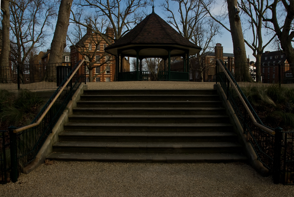 Arnold Circus is part of the Boundary Estate, the first example of social housing development built by the London County Council in 1897 to replace one of London's most notorious slum areas - The Old Nichol Street Rookery - and immortalised in Arthur Morrison's fictionalised account of the life of a slum child A Child of the Jago. The rubble from the slum clearance was used to make a mound in the centre of the Circus, site of the bandstand which is still in existence. In the film Robinson considers the estate to be 'a fragment of a golden age, a utopia.'
